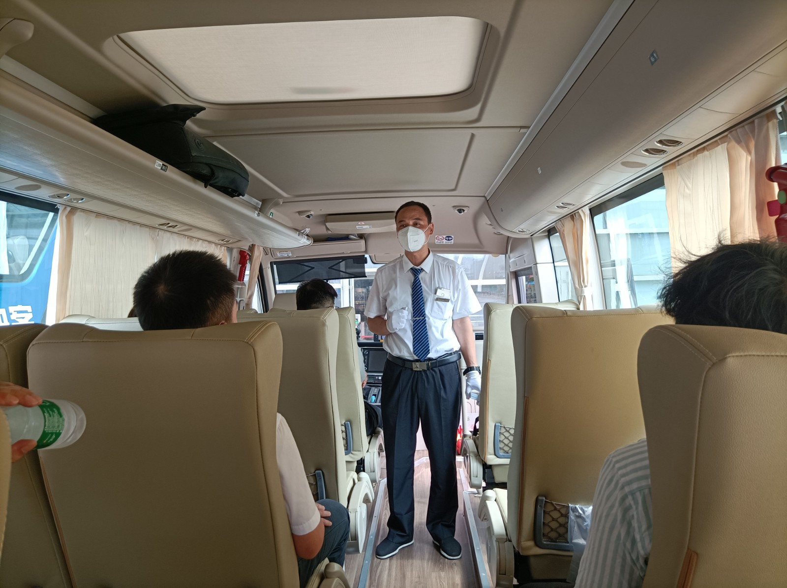 為迎接第一批旅客,班車提前做好了車輛檢查等準(zhǔn)備工作,駕駛員標(biāo)準(zhǔn)著裝提前等待,引導(dǎo)乘客上車。發(fā)車前對(duì)乘客進(jìn)行安全喊話,并提醒乘客系好安全帶,佩戴好口罩,確保旅客安全通暢。